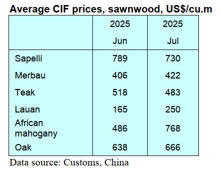 CIF prices for tropical sawnwood fell 5% to US$278 per