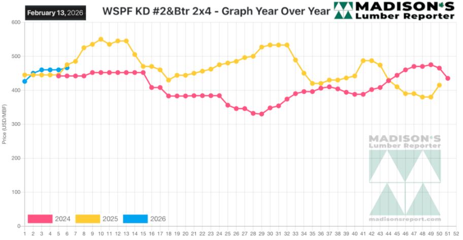 In the week ending February 13, 2026, the price of benchmark softwood lumber