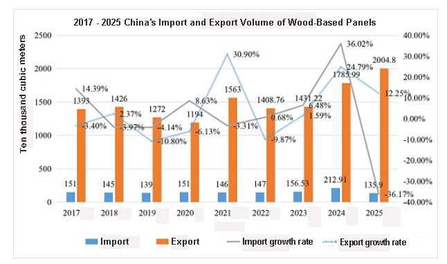 In 2025, China's total imports and exports of wood-based panels