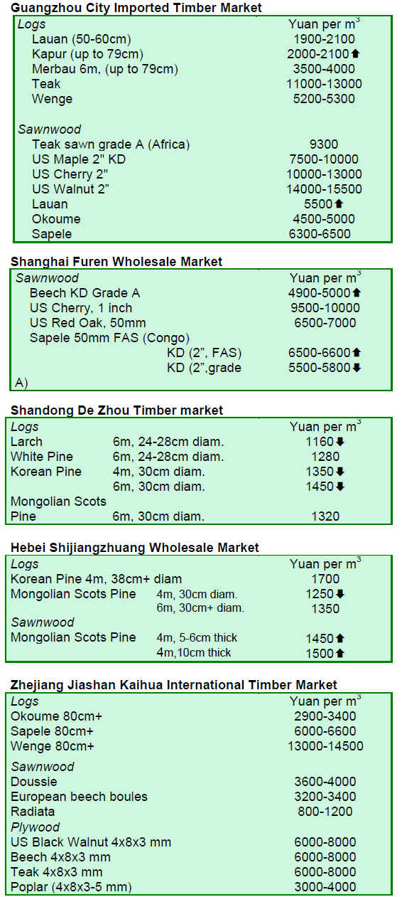 Russia, the major supplier of sawnwood, saw China¡¯s imports increase by 40% from the same period last year. Canada, USA and Thailand also improved their exports to China significantly.