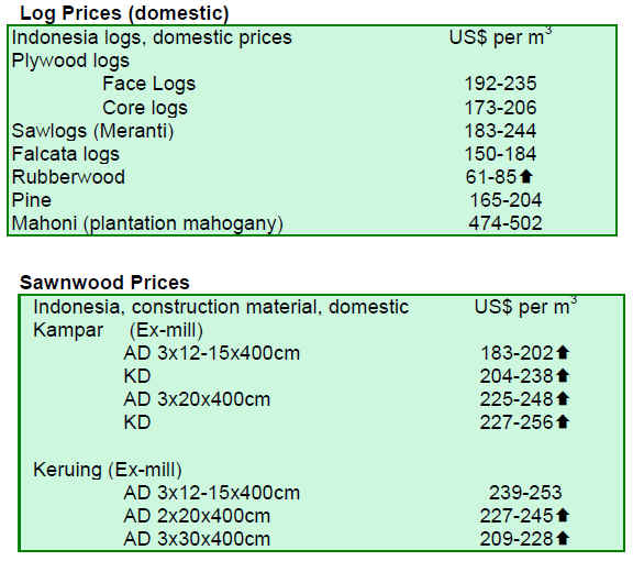 Premium quality, medium quality and lower quality sawmill logs were priced around US$1164-1320, US$1086 and US$466-620 per cu.m respectively.