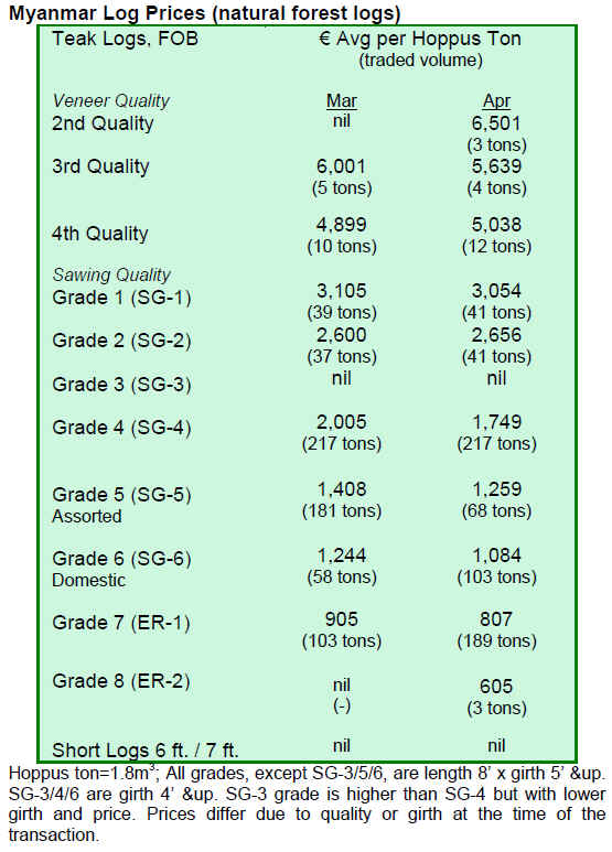 Laurel and Haldu were the main non-teak species traded and prices were around US$698 per cu.m for first quality logs, US$388 per cu.m for medium quality logs and US$116-194 per cu.m for lower quality logs.