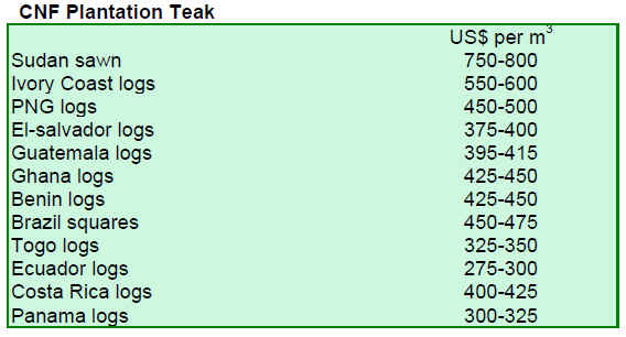 Long Teak logs suitable for keels were traded between US$3100-3490 per cu.m. Shorter categories fetched US$1784-1940 per cu.m.