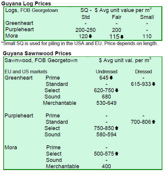 Sawnwood prices in select grade advanced for both Greenheart and Purpleheart (Undressed), US$750/620 and US$850/750 per cu.m respectively during this fortnight period. A price increase was also recorded for Mora in select grade.