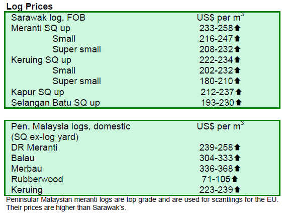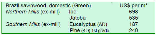 Analysts suggest that there may be some pick up in orders in late August at the close of the European vacation season, but apart from this, the prospects are not for any immediate recovery in demand for sawnwood. Sawnwood and log prices were unchanged through June 2010.