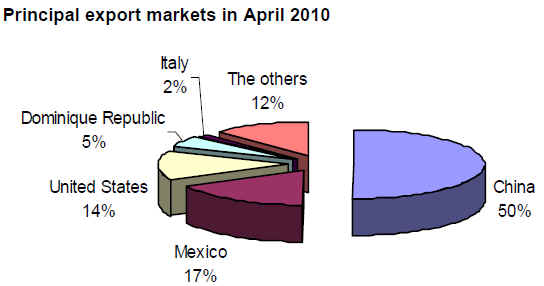 The main exported items in April were semi-manufactured products representing 47% share of the total volume. The accumulated exports from the beginning of the year totalled US$ 24 million representing a 28% increase over the same period in 2009.