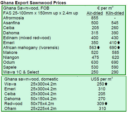 Prices for rough sawn (undressed) greenheart (select) sawnwood improved as did the prices for purpleheart and mora.