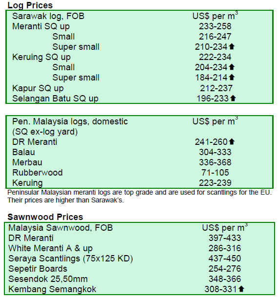 Prices for Malaysian timber products experienced some gains across the board during the period under review.
