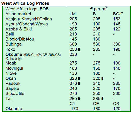 Log prices are firm with some occasional small adjustments following the upward trend in Malaysian log prices. West African shippers are now confident that the market and prices are likely to remain stable at least during the 3rd quarter.