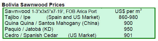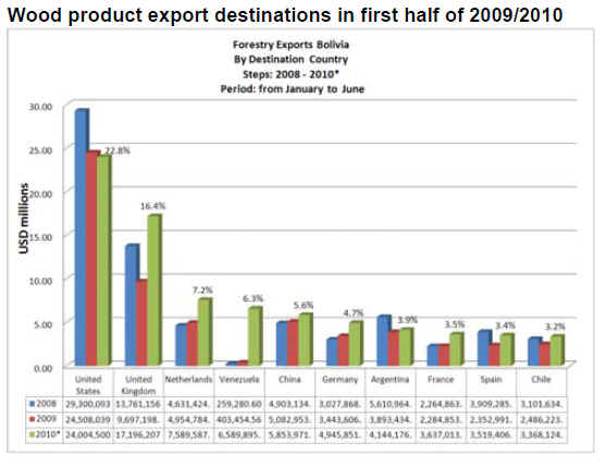 Forest product exports from Bolivia totalled US$105 million in the first half of 2010, up 33% from US$79 million in the same period last year.