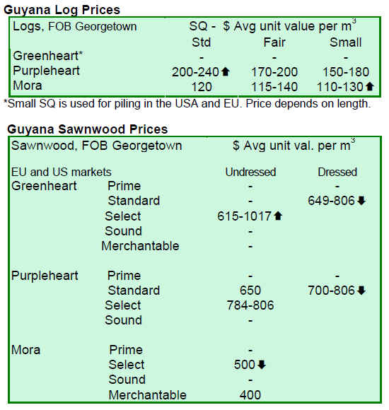During the period under review, undressed sawnwood prices for select quality greenheart jumped to US$1017 per cu.m while mora undressed sawnwood prices were relatively stable. Prices for dressed greenheart and purpleheart sawnwood dropped in this fortnight period. Guyana*s Washiba (Ipe) is in demand fetching high prices at US$1,637 per cu.m.