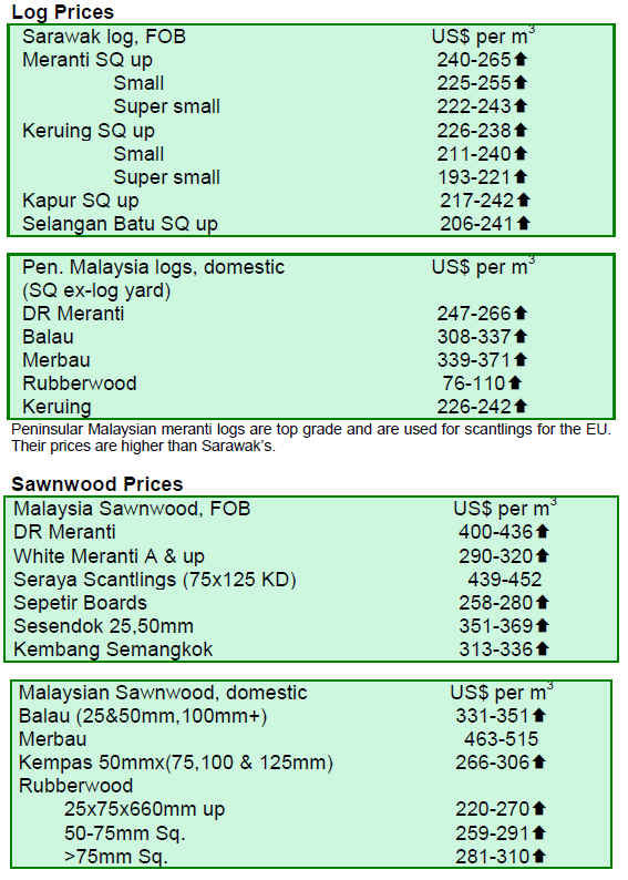 Prices of Malaysian timber products continue on an upward trend mainly due to the local currency*s appreciation against the US dollar. Sentiment among the traders, however, is cautious as the recovery of the US economy remains weak.