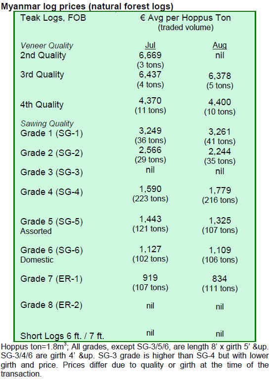 Pyinkado and Gurjan logs are not selling well, say analysts. For the Gurjan logs, extremely dry weather conditions earlier this year lowered the river levels and thus hampered log transportations by rafts. It is reported that the Gurjan logs now available in Yangon are not fresh enough to attract buyers.