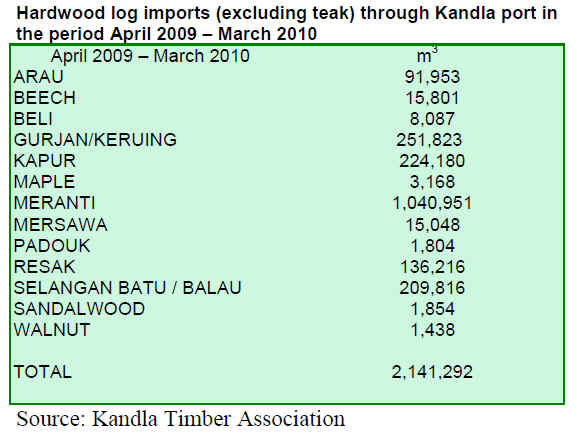 In the period April 2009 每 March 2010, a total of 3,300,000 cu.m of logs were imported through Kandla port which accounted for 52% of India*s total log imports. Out of the total, around 327,000 cu.m were teak logs and 2,141,292 cu.m other hardwood logs. The following table presents hardwoods log imports through Kandla port in the period April 2009 每 March 2010.
