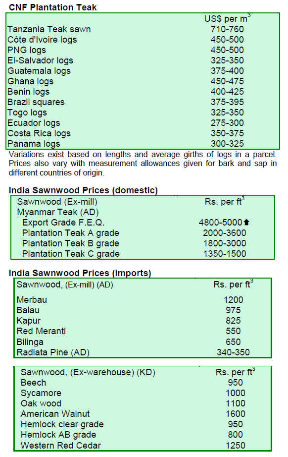 Auctions of teak in Central Indian depots continued to attract active buying. The total sales of teak logs were 8,000-10,000 cu.m with prices around Rs.50-75 per cft. higher than in the previous auctions at the end of July. Premium quality saw logs were priced at Rs.1,500 per cft., medium quality around Rs.1,000-1,200 per cft. and average quality attracted prices of Rs.800 per cft.