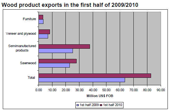 In the first half of 2010, the main exported items were semi-manufactured products with a 46% share of the total wood product export volume. The exports totalled US$38 million representing a 51% increase over the first half of 2009.