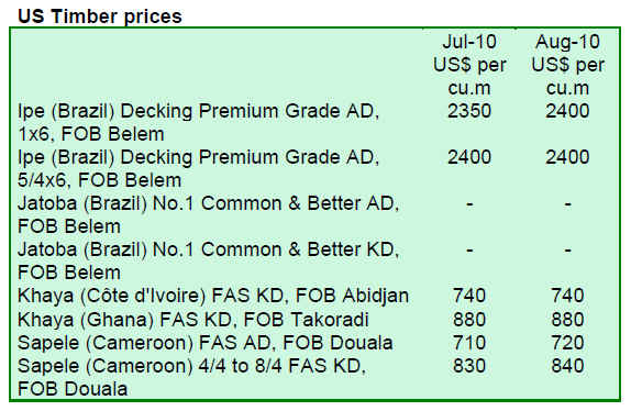 US imports of hardwood plywood will likely exceed 2009 volumes, based on year-to-date imports of 1.1 million cu.m, which is 32% higher than in the same period last year. China remains the dominant supplier. June 2010 imports from China were 165,355 cu.m (up 25% year-to-date). Indonesia is the second-largest supplier, imports to the US totalling 20,375 cu.m in June (up 99% year-to-date). June imports from Ecuador were 5,975 cu.m (up 49% year-to-date) and from Brazil 1,738 cu.m (down 21% year-to-date).