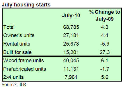 Total housing starts in Japan during July were 68,785, the second consecutive month of increase. However, even though housing starts grew 4.7% compared to levels in July last year, the figure for July 2010 is the second lowest ever recorded.