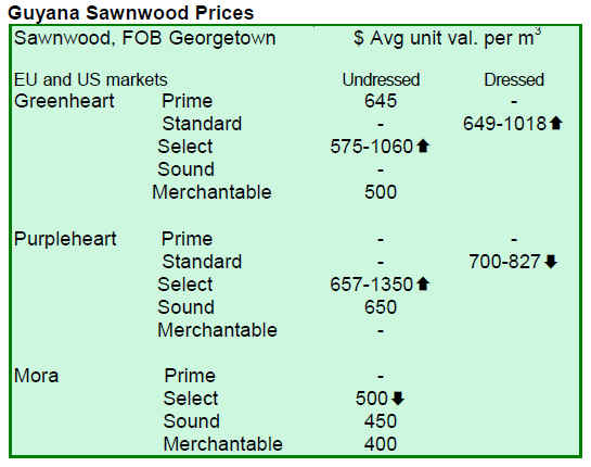Dressed greenheart prices inched up from US$975 per cu.m to US$1018 per cu.m. Dressed purpleheart prices were down in the period under review.
