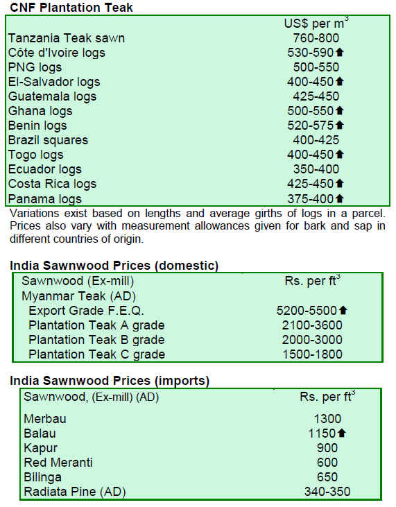 For sawnwood, undressed greenheart (select) prices gained from US$933 per cu.m to US$1,060 per cu.m over the period under review, while prices for undressed greenheart (merchantable) remained stable. Undressed purpleheart (select) gained from US$1,000 per cu.m to US$1,350 per cu.m while mora sawnwood prices were steady.