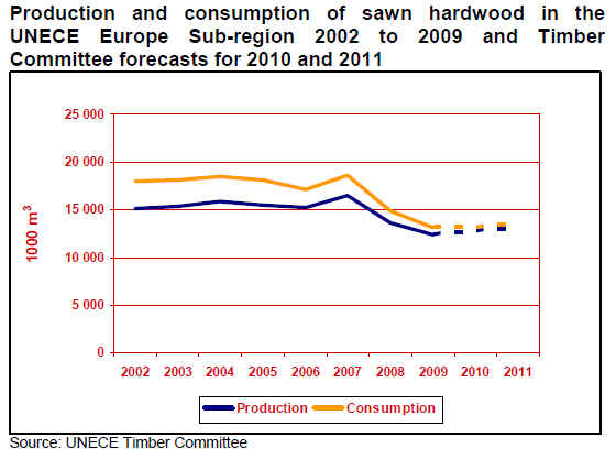 Between 11 and 14 October, the United Nations Economic Commission for Europe (UNECE) Timber Committee met to discuss timber markets throughout Europe, North America and the CIS countries. The committee¡¯s conclusions and forecasts relating to sawn hardwood production and consumption across the region are shown in the chart below. The committee reckoned that total sawn hardwood consumption across the European region fell from a peak of 18.7 million cu.m in 2007 to only 13.7 million cu.m in 2009. Consumption during 2010 and 2011 is forecast to remain largely unchanged at this low level.