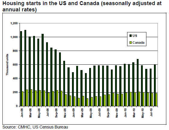 US housing starts increased in August to 598,000 (seasonally adjusted rate). This is a 10.5% increase from the previous month and +2.2% above the August 2009 rate. Multi-family housing starts grew more than single-family starts. The number of building permits authorized in August increased slightly from July (+1.8%), but this is still 6.7% below August 2009 figures. Permits for single-family homes decreased by 1.2% from July. The number of permits issued can be an indicator of future building activity.