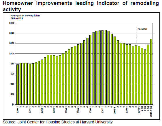 The outlook is more positive on the home renovation side. Homeowner improvement spending in the US is expected to grow by almost 5% in 2010. The Leading Indicator of Remodeling Activity by the Joint Center for Housing Studies at Harvard University expects spending on remodeling will recover this year.