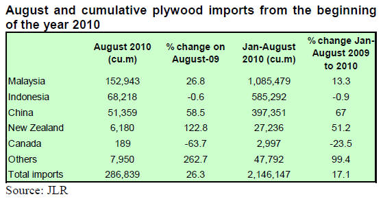 August plywood imports amounted to 286,800 cu.m, an increase of 26% from