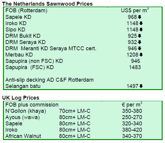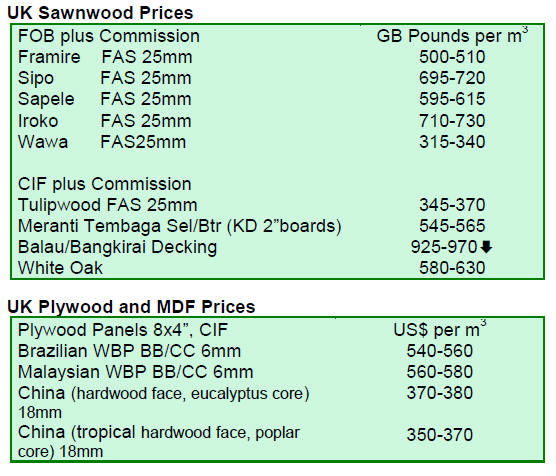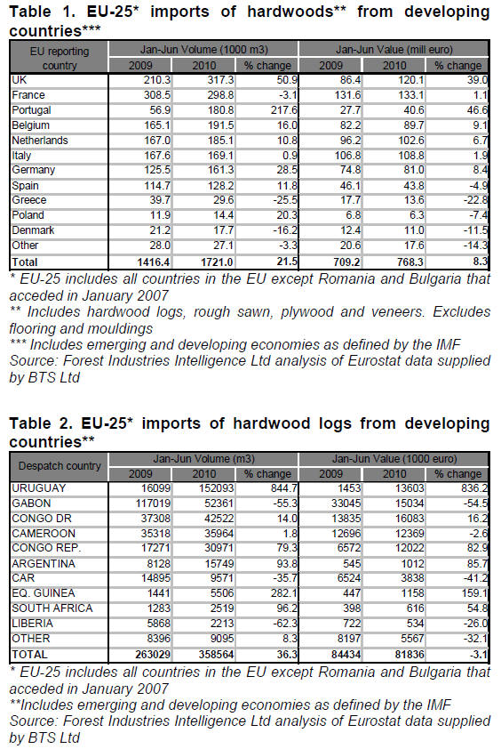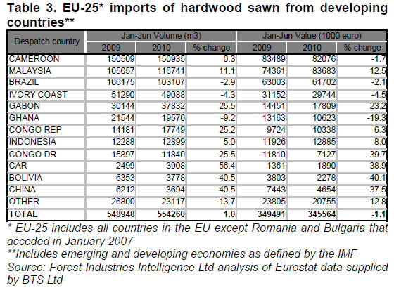 The trade data confirms anecdotal reports that the anticipated recovery in European tropical sawn lumber market was very slow and patchy during the first half of 2010. Table 3 shows that EU-25 imports of hardwood sawn from developing countries during the first half of 2010 were almost equivalent to imports during the same period in 2009. Gains in EU imports of hardwood sawn lumber from Malaysia, Gabon and the Congo Republic were offset by continuing declines in imports from Brazil, Ivory Coast, Ghana and the Democratic Republic of Congo.