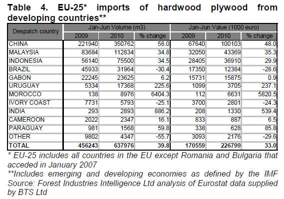 There were, however, much clearer signs of recovery in the European market for hardwood plywood during the first half of 2010 (Table 4). Overall imports of hardwood plywood from developing countries increased almost 40% during the six month period compared to the same period in 2009. There was particularly strong growth in European imports of hardwood plywood from China, confirming anecdotal reports that China has been gaining market share in this sector during the recession, largely owing to its continuing ability to offer product at highly competitive prices. However sales of Malaysian and Indonesian plywood also made significant gains. Chinese and tropical hardwood plywood have benefited during 2010 from rising prices for Russian birch plywood as a result of the forest fires that raged through Russia this summer. Another notable trend this year is the emergence of Uruguay as a more significant supplier of hardwood plywood to the EU following intense marketing of products derived from plantation-grown eucalyptus as an environmentally-friendly alternative to tropical hardwood plywood.