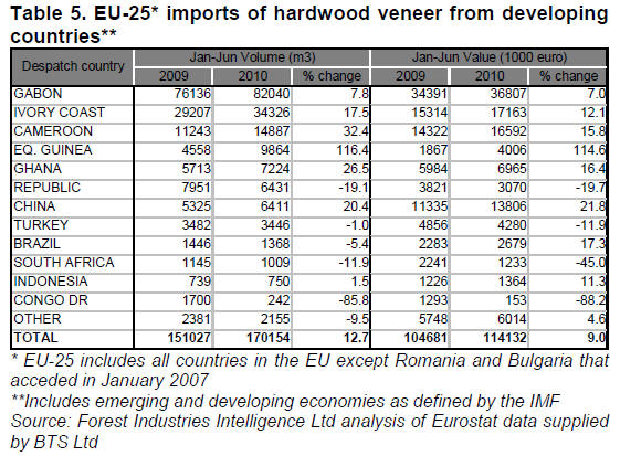 manufacture (Table 5). Overall EU veneer imports during the first half