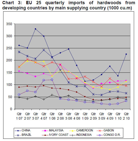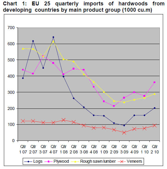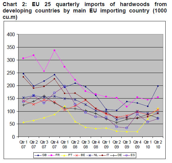 Chart 2 shows that imports of hardwood products from developing countries by the UK and Portugal made significant gains in the second quarter of 2010, due respectively to spikes in imports of plywood and eucalyptus logs. Imports into Belgium and Italy continued to improve slowly during the second quarter of 2010, while imports into Spain showed a slight improvement on the desperately low levels recorded in the first quarter of 2010. However, the recovery in German imports stalled during the second quarter of 2010, particularly disappointing after three consecutive quarters of growth between June 2009 and March 2010.