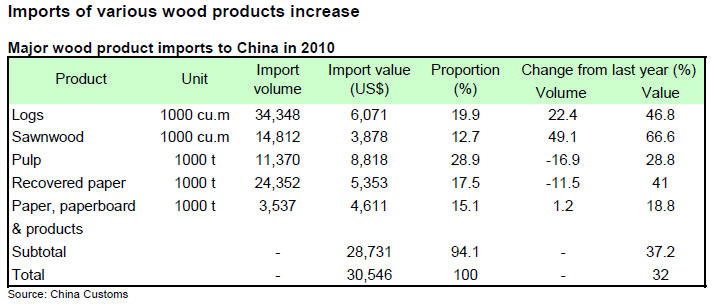 Fibreboard imports in 2010 amounted to 268,300 tonnes,
