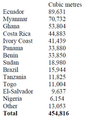 The table provides information on the volume of imports from countries supplying more than 5000 cubic metres of plantation teak during the year.