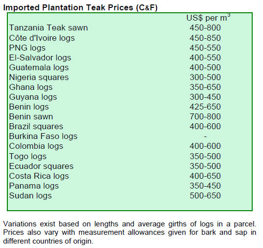 The price range reflects differences in the length and cross section. Analysts say the trend to replace teak with other durable tropical hardwoods continues, driven mainly by the high price of teak.