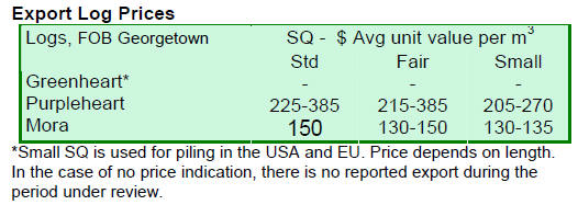 Guyana did not export any Greenheart logs in the period under review. However, some shipments of Purpleheart logs were made and the Guyana Forestry Commission reported that prices were at favourable levels. The maximum price for Standard Sawmill Quality Purpleheart log rose as high as US$385 per cubic metre.