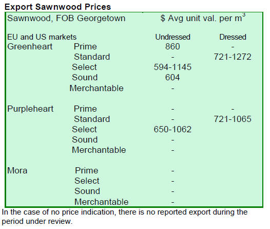 During the period under review average export prices for Greenheart Select sawnwood (Undressed) moved up from US$721 to US$1,145 per cubic metre.