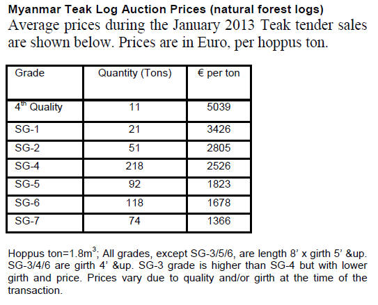 The Myanma Timber Enterprise (MTE) open tenders for February will be held on the 22nd and the 25th and a report on the average log prices will appear in the next TTMR.