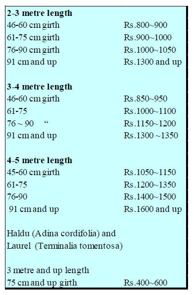The latest average prices for teak and other hardwoods at government teak depot tenders in Central India are shown below. Prices are in rupees per cubic foot, ex depot.