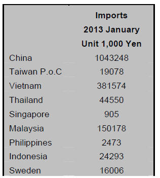 on imports in January 2012. In January 2013 China was the largest supplier