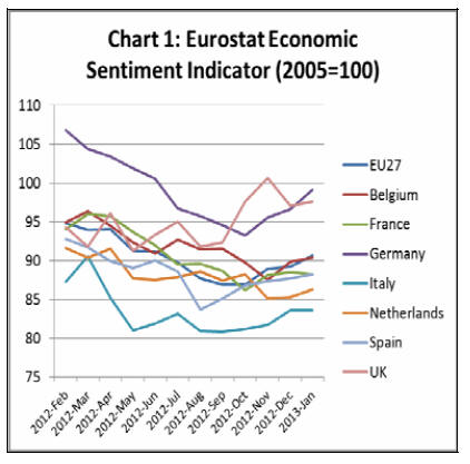 Fourth quarter 2012 GDP data for the large euro-zone economies - France, Germany, Italy, and Spain - has yet to be published, but economists are already pencilling in likely declines across the board. After a bouyant 3rd quarter of 2012, the UK economy shrank again (by 0.1%) in the last quarter of the year.