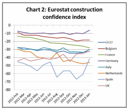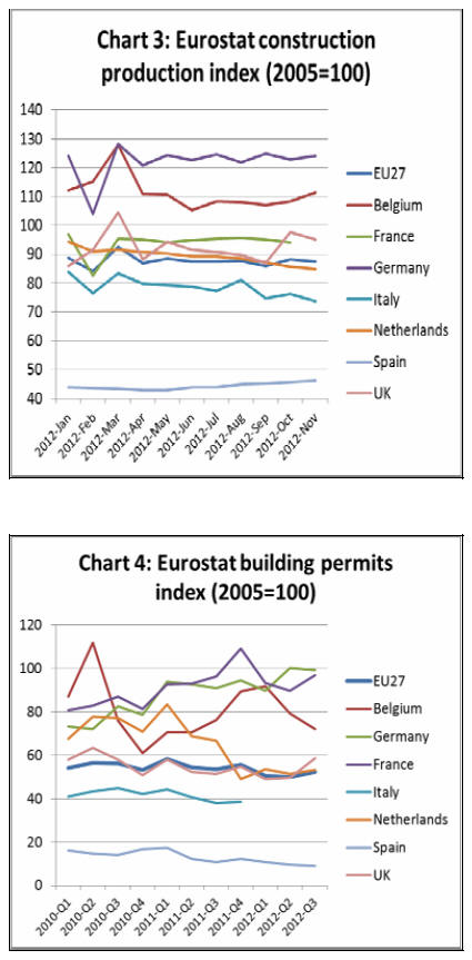 Activity in the construction sector remains very slow and may even decline further this year. Latest data for the Eurostat Construction Production Index (Chart 3) and Building Permits Index (Chart 4) have yet to show any sign that the market has turned a corner.