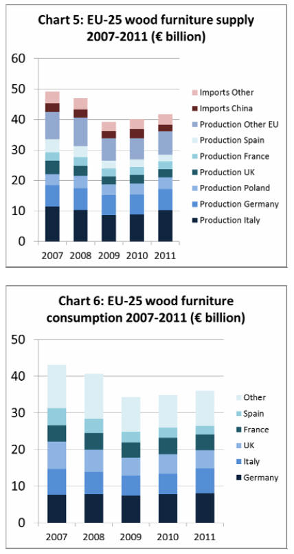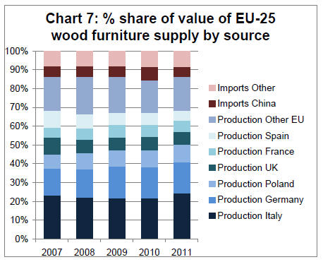 In fact, the two largest western European producers, Italy and Germany, together account for over 40% of all wood furniture supplied into the EU, and this share was actually rising during the five year period between 2007 to 2011 (Charts 5 and 7).