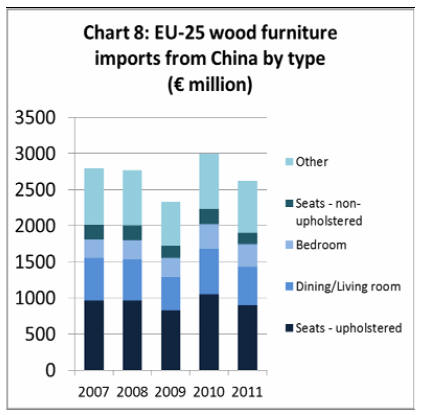 However, this import level seriously over-shot actual consumption and imports fell back again to €2.6 billion in 2011. In 2011, upholstered seating was the main wood furniture product imported into the EU from China, accounting for 34% of import value. Of the remainder, 20% was dining/living room furniture, 12% was bedroom furniture, 6% was non-upholstered seating and 28% other product categories.