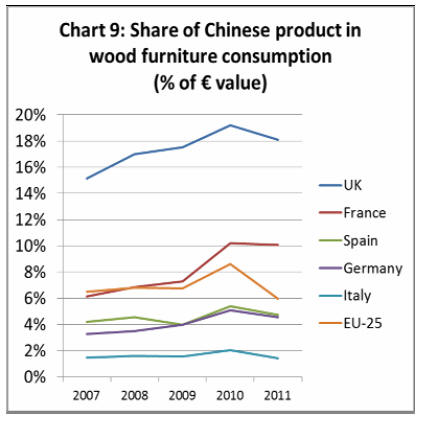 China¡¯s share in total EU wood furniture consumption peaked in 2010, at 8%, before falling away to 6% in 2011 (Chart 9). China¡¯s penetration of the market varies widely between EU Member States, from 16% in the UK to less than 2% in Italy.
