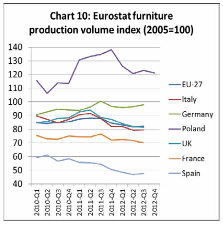 Furniture production during the first nine months of 2012 in Italy, Poland, the UK, France and Spain was significantly lower than during the same period the previous year. However production in Germany during 2012 was higher than in 2011.
