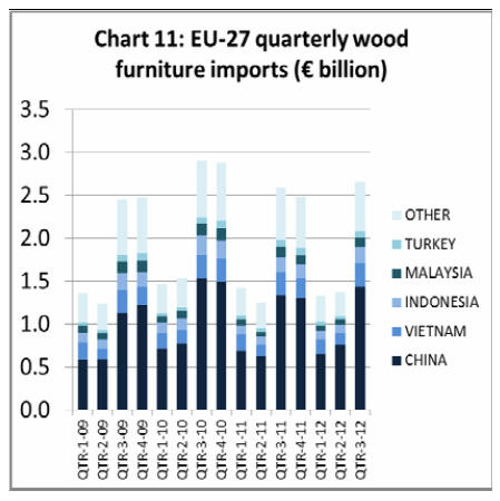 Trends in EU wood furniture imports during 2012 are more difficult to assess due to the highly seasonal nature of trade and lack of published data for the last quarter of the year ¨C when a large proportion of product is imported in time for Christmas and the January sales period (Chart 11).