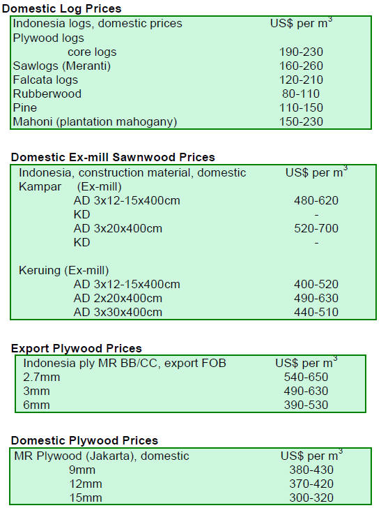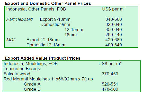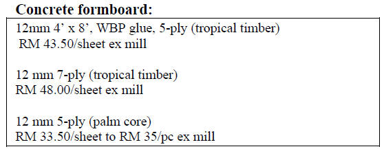 Sarawak mills indicate that export FOB prices for plywood (MR BB/CC) are 2.7 mm US$550 per cubic metre and US$445-450 for 9 mm & up.