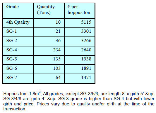 Average prices during the recent auction are shown below. Prices are per cubic foot ex depot.