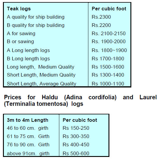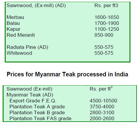 Auction sales of approximately 3000 cubic metres of teak and other hardwoods were concluded at government forest depots in Rajpipla and at depots in Western India. For fresh log lots prices were higher but prices for logs which had been felled some time ago prices were cheaper than even at previous sales. Average prices for the latest sales are shown below.